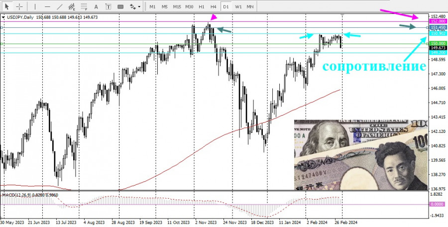 С другой стороны, область 150,90 продолжает действовать как непосредственное сильное сопротивление, выше которого пара USD/JPY ускорит позитивное движение к барьеру 151,45. Далее импульс сможет поднять спотовые цены до уровня 152,00, или многолетнего максимума, установленного в октябре 2022 года и повторного тестирования в ноябре 2023 года.