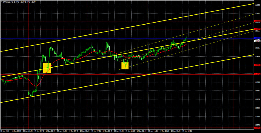Анализ EUR/USD 5M. Валютная пара EUR/USD в понедельник продемонстрировала сдержанный рост. Рост евро, как следствие падения американской валюты, мог бы быть гораздо более сильным, так как поводов хватало и на этот раз. Напомним, что в 2026 году буквально через день поступают сообщения от Дональда Трампа, которые указывают только на одно – на падение доллара. Правда, сам доллар не спешит падать, а рынок не спешит его продавать. Флэт между уровнями 1,1400 и 1,1830 на дневном ТФ сохраняется семь