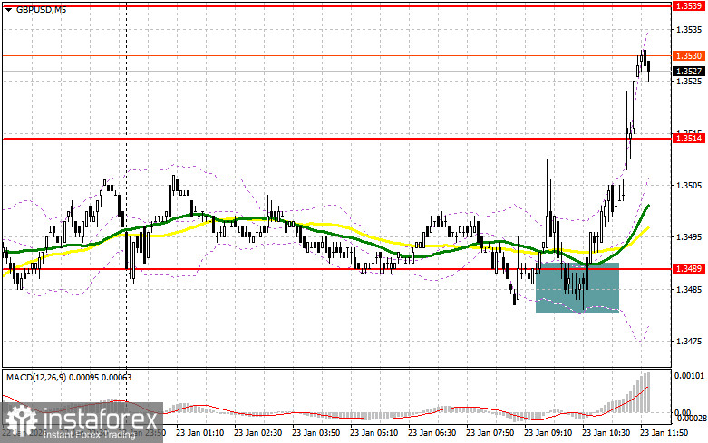 В своем утреннем прогнозе я обращал внимание на уровень 1.3489 и планировал от него принимать решения по входу в рынок. Давайте посмотрим на 5-минутный график и разберемся с тем, что там произошло. Снижение и формирование ложного пробоя в районе 1.3489 привели к точке входа на покупку фунта, что вылилось в рост пары на 40 пунктов. На вторую половину дня техническая картина была пересмотрена.