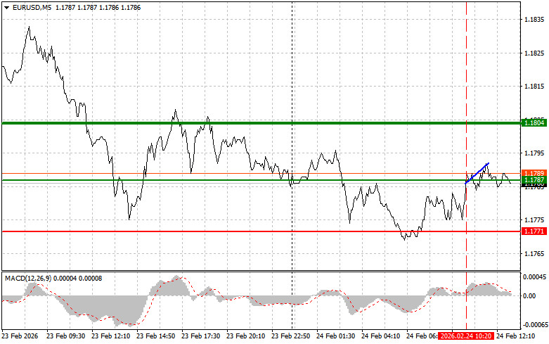 Разбор сделок и советы по торговле европейской валютойТест цены 1.1787 пришелся на момент, когда индикатор MACD только начинал движение вверх от нулевой отметки, что стало подтверждением правильной точки входа на покупку евро. В результате пара выросла лишь на 7 пунктов и на этом все закончилось.Из-за нехватки статистических данных по еврозоне наблюдалась довольно спокойная торговля, которая не привела к серьезному изменению в расстановке сил на рынке. Трейдеры и инвесторы, оставшись без свежей информации для принятия взвешенных решений, решили поумерить сократить свою