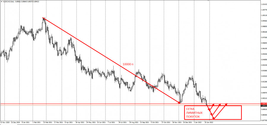 Начиная от текущих цен (0,89500 и ниже) возможна установка сетки лимитных покупок с шагом 500-1000 п по 5 знаку. После набора лонгов на падении выход из сетки с профитом осуществляется на тесте пробитых уровней снизу либо +1 п по первому ордеру в сетке либо +1000 п по прибыли первого ордера. Напоминаем, что работа сеточным методом торговли предусматривает существенные по времени и расстоянию удержания позиций. По этой причине рекомендуем использовать бессвоповые счета, не увеличивать объёмы в сетке (0,01 стандартного лота на каждую 1000$ депозита) и рассчитывать на проход против себя до 5-6 т. пунктов. Если вы уже находитесь в наборе NZDCAD и планируете набирать AUDCAD - рекомендуем поделить между ними объёмы.